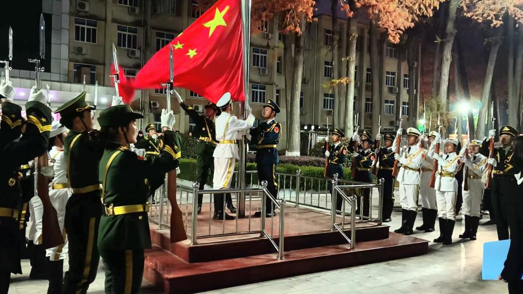 伴随着慷慨激昂的《义勇军进行曲》,国旗护卫队迈着铿锵有力的步伐护送国旗入场,鲜艳的五星红旗在晨光中冉冉升起,全体师生肃立,行注目礼,高唱国歌,现场气氛庄严肃穆。