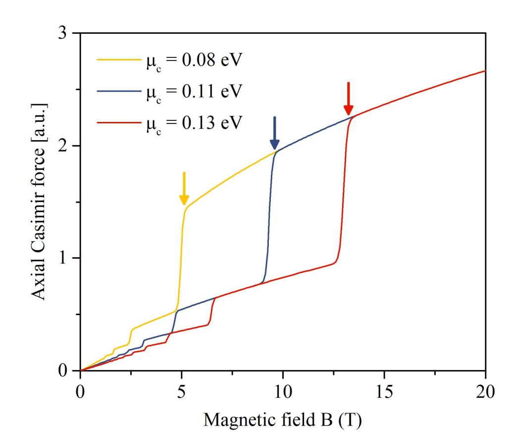 图2:轴向Casimir力随着磁场变化呈现量子化的阶梯变化规律。
